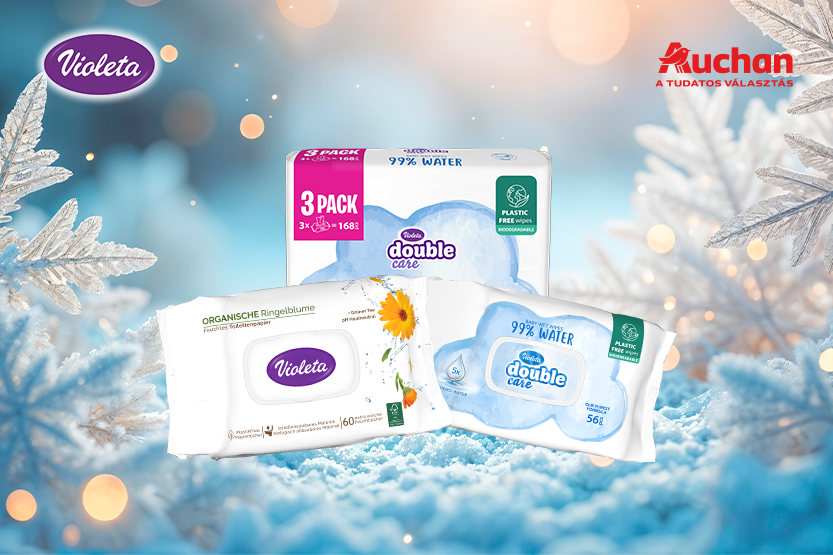 📣 Prémium minőségű Violeta Double Care popsitörlők és nedves toalettpapírok most kedvezményes áron az Auchan kínálatában! 💜