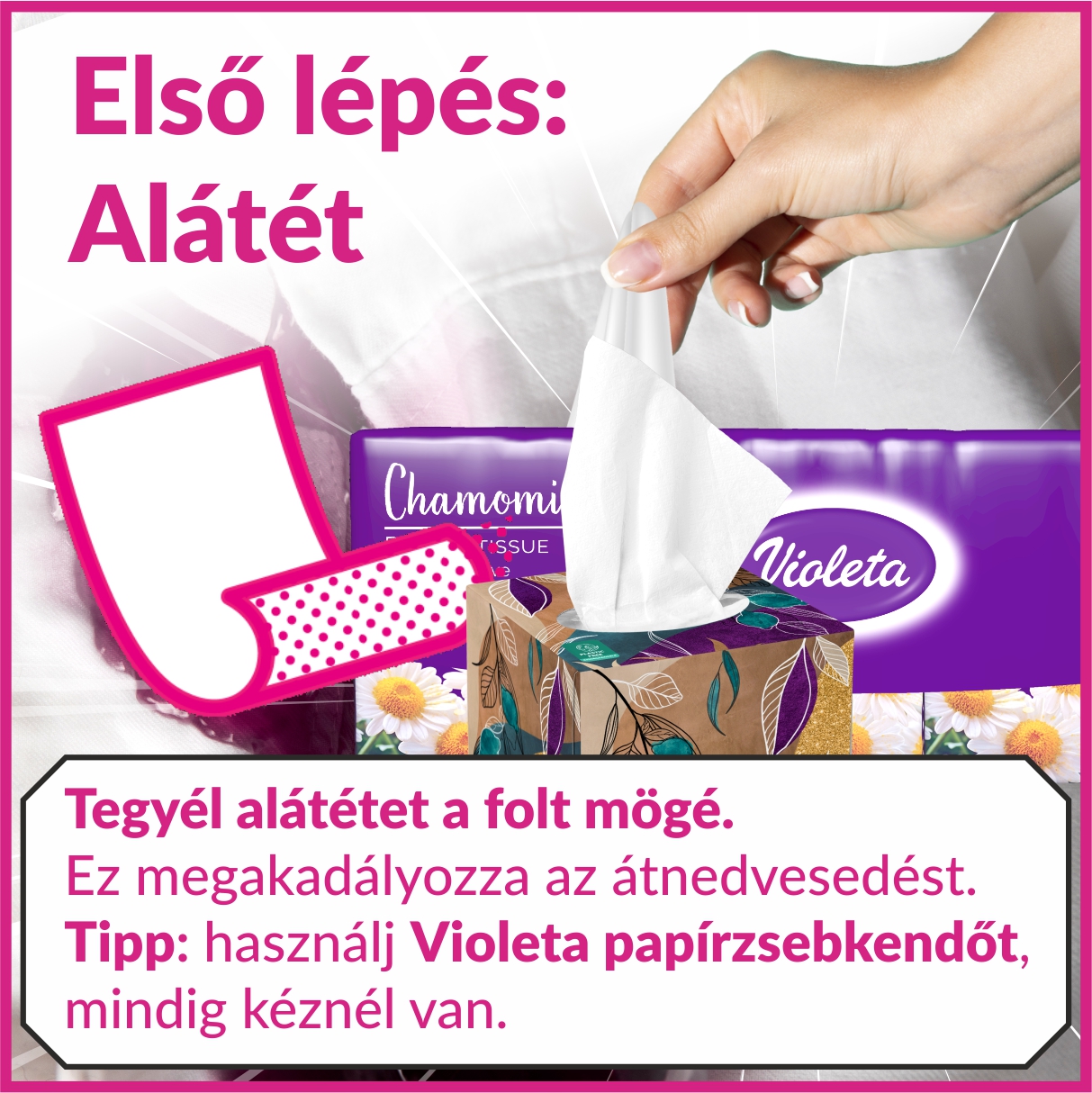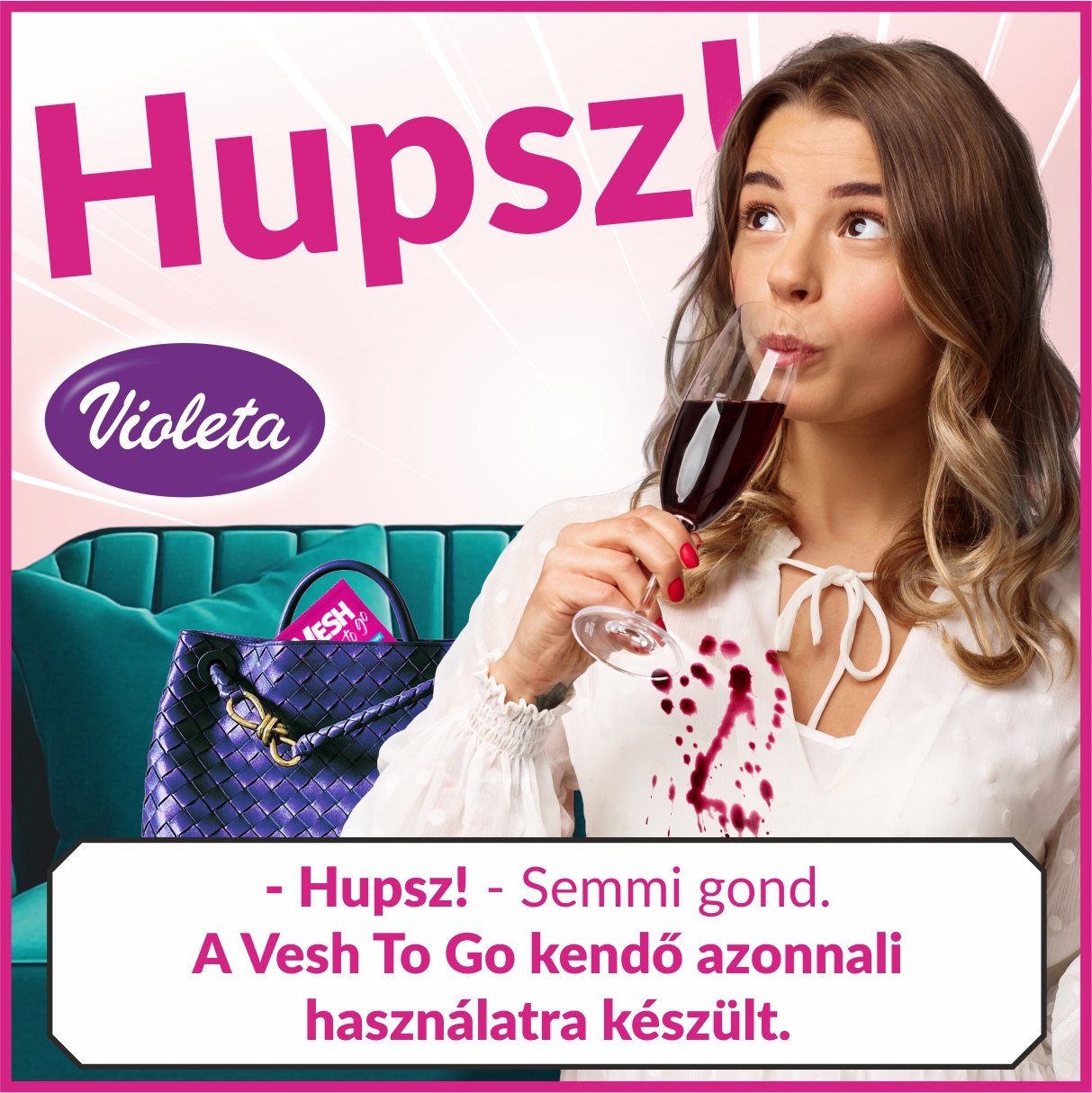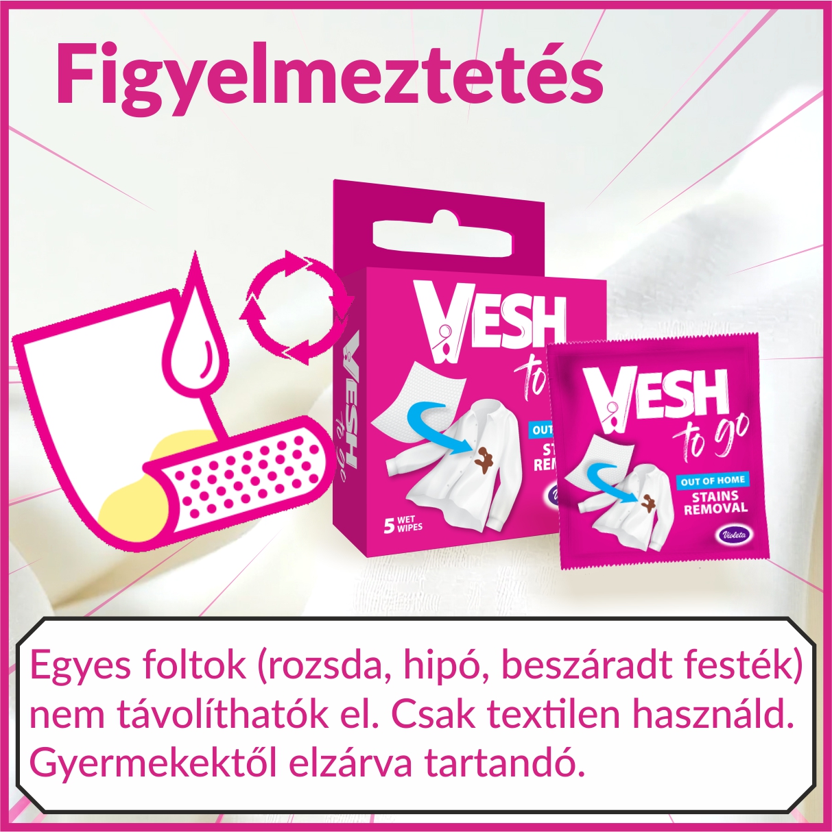 A VIOLETA Vesh TO GO foltttisztító kendő praktikus, 5 darabos kiszerelésben kapható, minden darab külön csomagolva, így mindig friss marad. Hatékonyan eltávolítja a sminket, ital- és ételfoltokat, miközben kíméli a kényes anyagokat is. Bőrgyógyászatilag tesztelt összetétele biztonságos használatot garantál, és kompakt méretének köszönhetően bárhová magunkkal vihetjük – legyen szó utazásról, munkahelyről vagy egy esti programról.